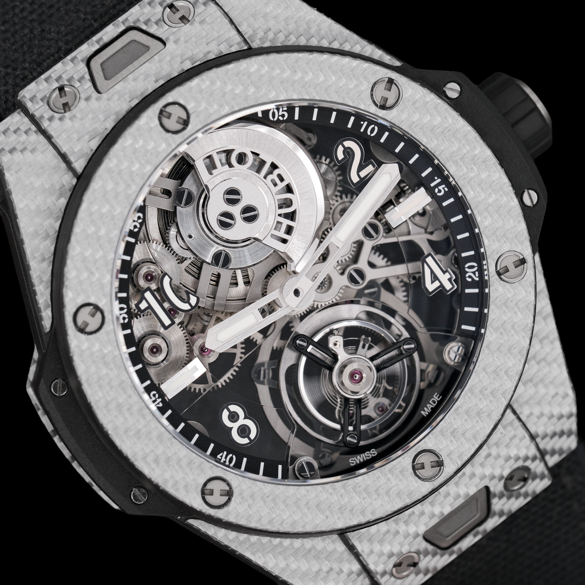 El diseño del nuevo reloj Big Bang Integrated Tourbillon Carbon ha sido posible gracias a la acertada fusión de estos materiales. Su movimiento se integra en una caja de fibra de carbono de 43 mm de diámetro, lo que aporta dos grandes ventajas: resistencia y ultraligereza. Gracias a esta construcción, la cabeza del reloj (caja y calibre, sin la correa) pesa solo 42 g, lo que significa que Hublot puede liberarse de la noción de que un reloj robusto tiene que ser pesado, con su correa integrada perfectamente ergonómica.