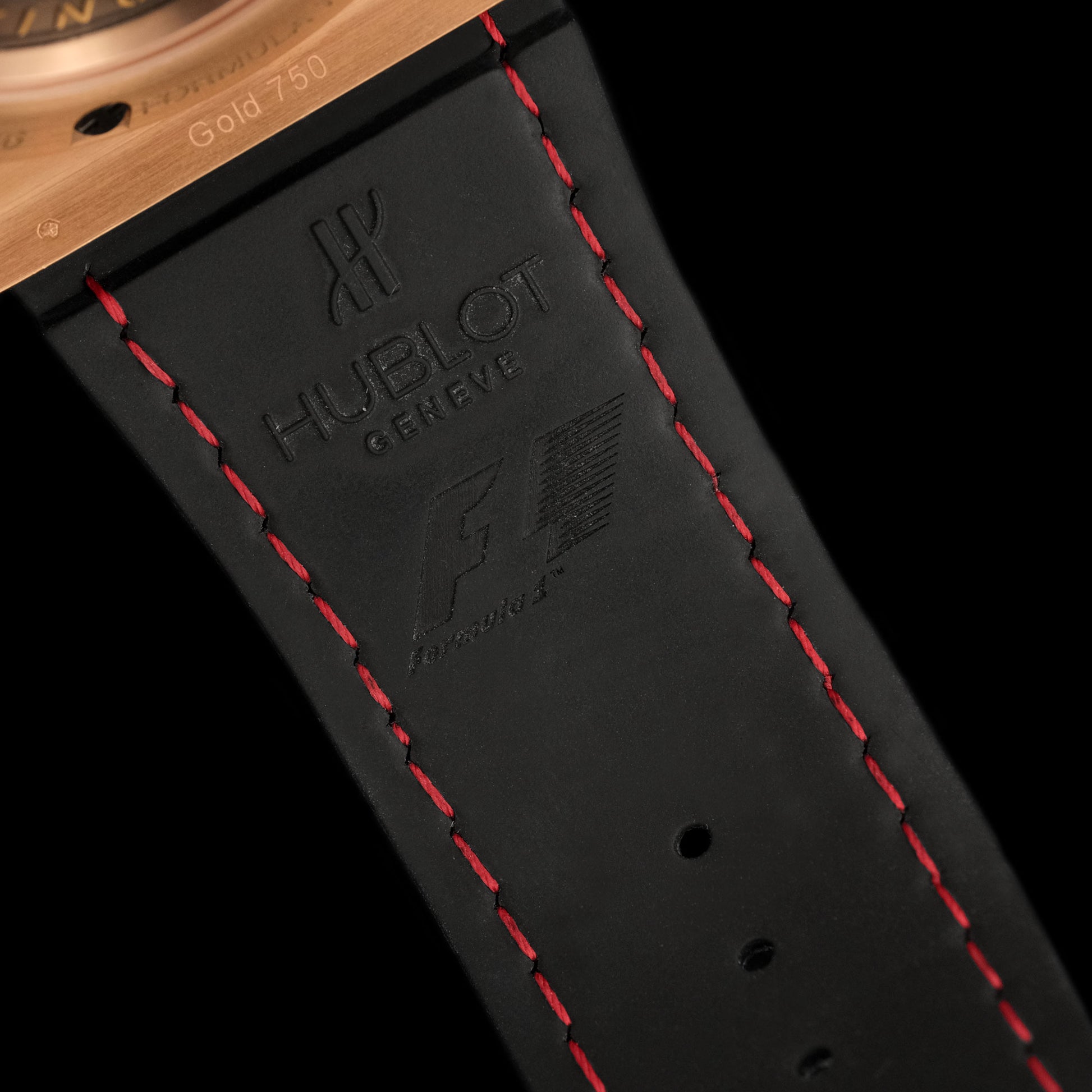 La correa combina piel de aligátor negro horn back cosida sobre caucho negro, con costuras rojas en contraste. En cuanto a la caja, está fabricada en King Gold de 18 quilates, la exclusiva aleación de oro desarrollada por Hublot. Su tonalidad es más rojiza que el tradicional oro rojo 5N, lograda al aumentar el porcentaje de cobre y añadir platino para estabilizar el color a lo largo del tiempo y evitar la oxidación. La composición exacta de esta aleación permanece en secreto.