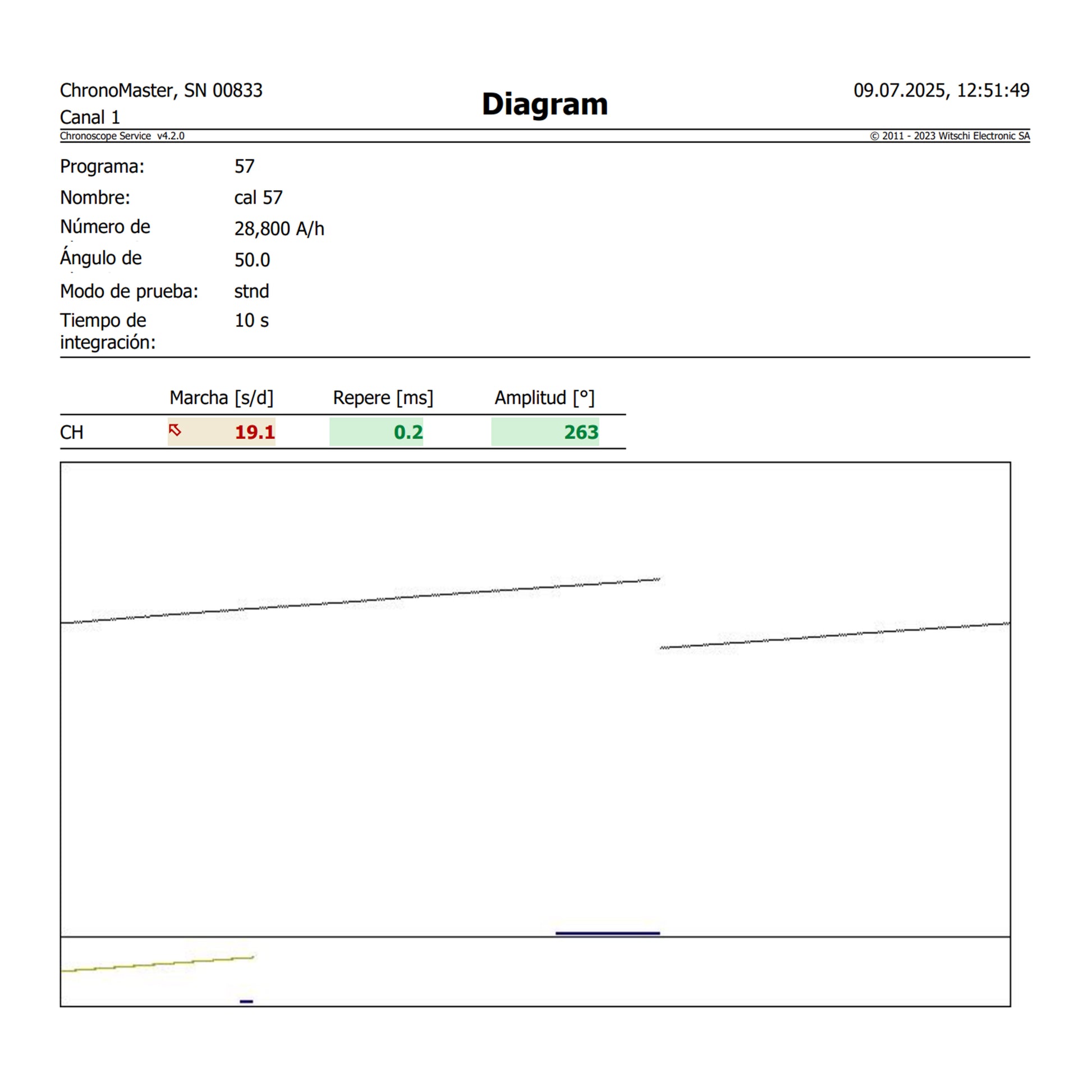 El dial está dividido en sectores concéntricos que combinan acabados opalinos, satinados y pulidos, aportando una profundidad visual única. El anillo central alberga los totalizadores del cronógrafo, mientras que la escala taquimétrica azul sobre el borde externo y los índices impresos en negro aportan funcionalidad con elegancia. Las manecillas esqueletizadas tipo jeringa, tratadas en azul, completan el conjunto con un aire técnico y sofisticado.