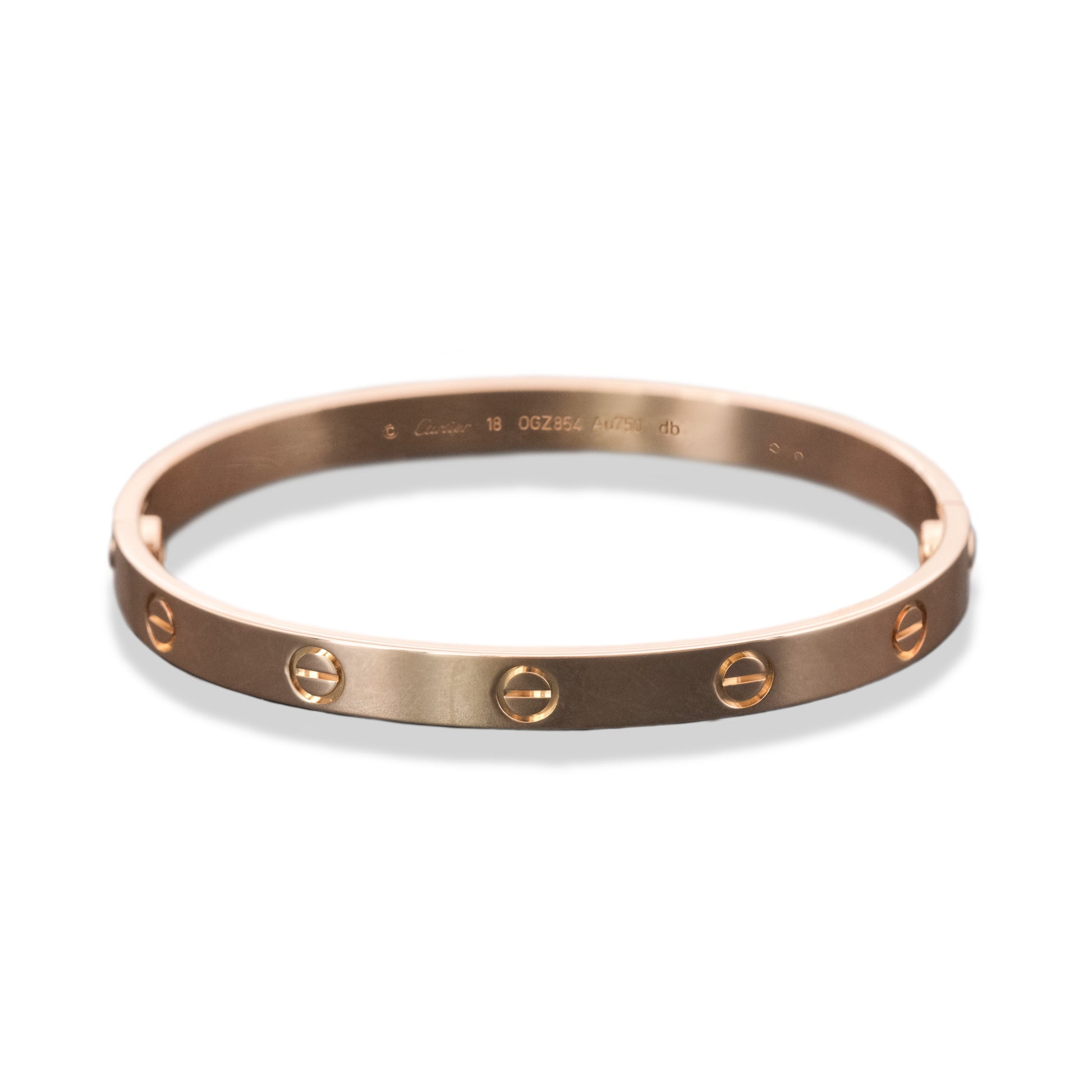 Pulsera LOVE, oro rosa 750/1000. Incluye el destornillador. Ancho: 6,1 mm. Creada en Nueva York en 1969, la pulsera LOVE es un icono de diseño joyero: una pulsera oval, compuesta por dos arcos rígidos, que se luce ajustada en torno de la muñeca y se retira con un destornillador concreto. El sistema de cierre consta de dos tornillos funcionales situados en ambos lados de la pulsera: necesitarás la ayuda de otra persona para abrirla o cerrarla. Para determinar la talla de tu pulsera LOVE, mide tu muñeca y añade un centímetro a tu talla para lucirla ajustada o dos centímetros para un ajuste más holgado. Ten en cuenta que el peso en quilates, el número de piedras y las dimensiones del producto pueden variar en función del tamaño de la creación solicitada. Ponte en contacto con nosotros para obtener más información.