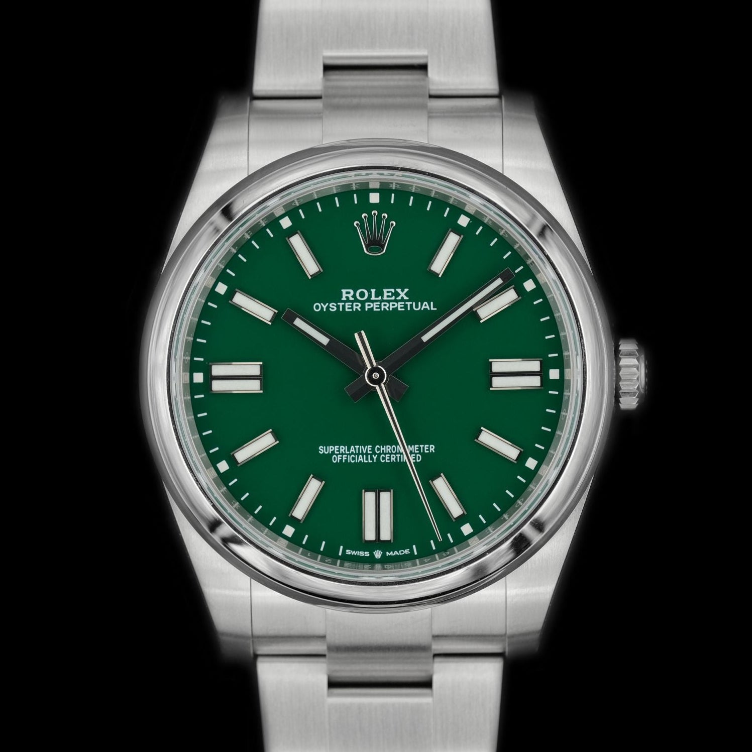 El Rolex Oyster Perpetual ref. 124300 con carátula verde es una de esas piezas que enamoran a primera vista. Su diseño limpio y perfectamente balanceado permite que el protagonista absoluto sea el vibrante tono verde de la carátula, un color que se ha convertido en un verdadero sello contemporáneo de Rolex. Es moderno, elegante y con mucha personalidad, sin perder ese aire clásico que hace a la marca inconfundible.