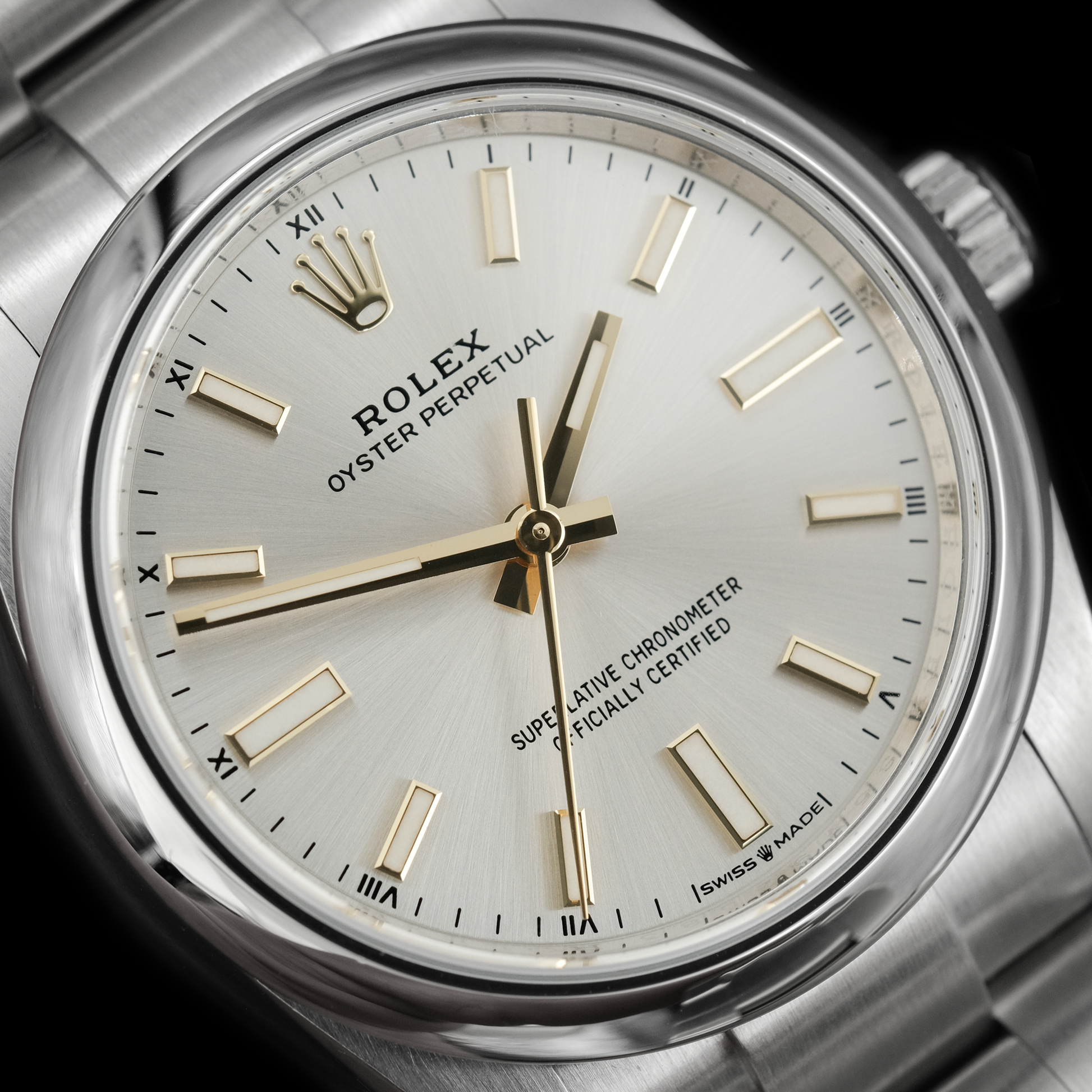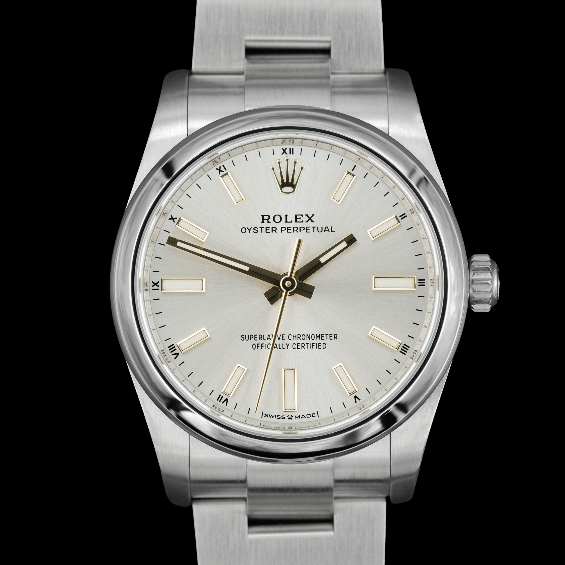 El Oyster Perpetual es el reloj de vestir estándar de Rolex, solo con función de hora. Su diseño minimalista presenta marcadores de hora simples, agujas centrales y un bisel liso. Al mismo tiempo, este reloj es indudablemente un exclusivo Rolex. Cuenta con la excepcional artesanía asociada con la Gran Corona, materiales superiores y la última tecnología innovadora en relojería. Con resistencia al agua de 100 metros, cuerda automática y una caja de 34 mm, este Rolex se convertirá rápidamente en tu reloj favorito.