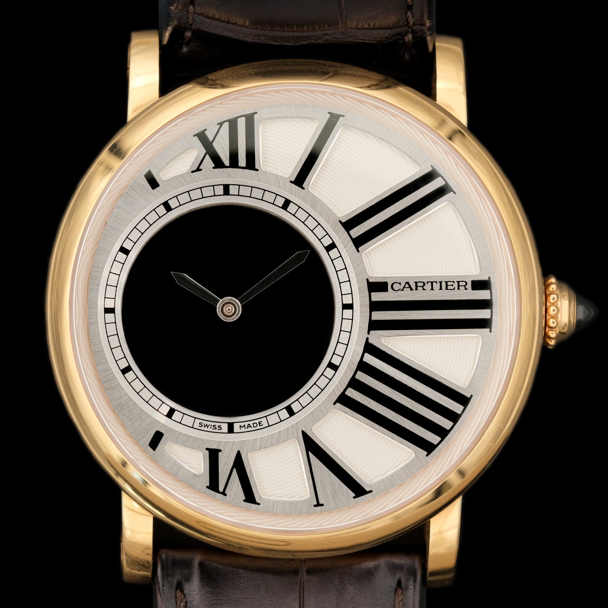 El Cartier Rotonde de Cartier Mysterious Hours es un ejemplo magistral de la relojería creativa de la Maison. Su mecanismo se basa en el concepto de “reloj misterioso” que Cartier desarrolló desde principios del siglo XX en relojes de mesa. La idea consiste en lograr que las agujas de las horas y los minutos parezcan flotar en el espacio sin conexión visible al movimiento.